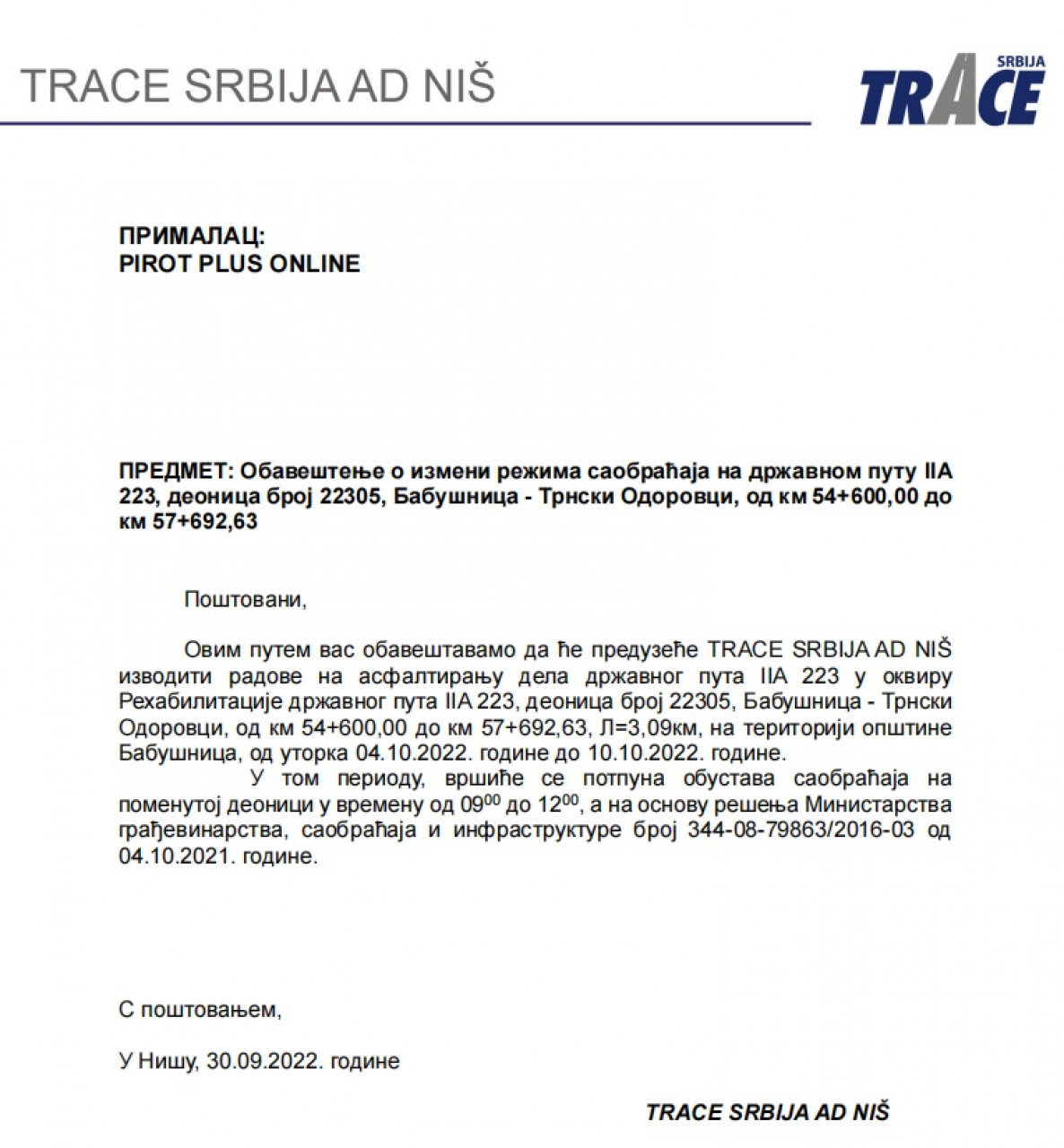 Iz preduzeća TRACE SRBIJA AD NIŠ obaveštavaju da će izvoditi radove na asfaltiranju dela državnog puta IIA 223 u okviru Rehabilitacije državnog puta IIA 223, deonica broj 22305, Babušnica - Trnski Odorovci, od km 54+600,00 do km 57+692,63, L=3,09km, na teritoriji opštine Babušnica, od utorka 04.10.2022. godine do 10.10.2022. godine.