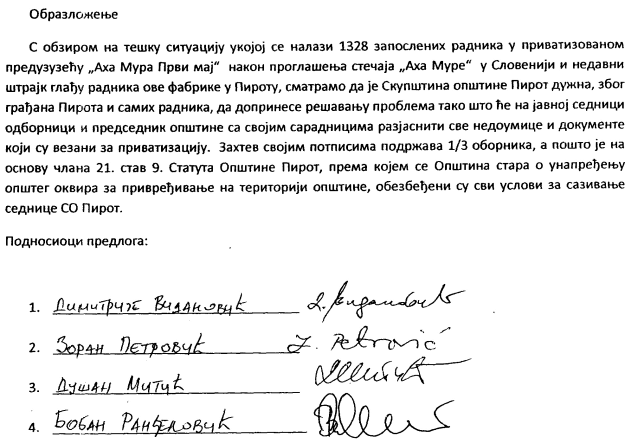 Objašnjavajući razloge zbog kojih je odbijen zahtev odbornika za održavanjem vanredne sednice, Milan Popović, predsednik Skupštine opštine Pirot rekao je da valjani razlozi za sazivanje sednice ne postoje jer Opština Pirot nije učestvovala u privatizaciji Prvog maja, shodno zakonskoj regulativi na to nije imala pravo, da je pismo o namerama pravno neobavezujuće jer Opština nema pravo shodno Zakonu o stečaju, da se uključuje u izradu .