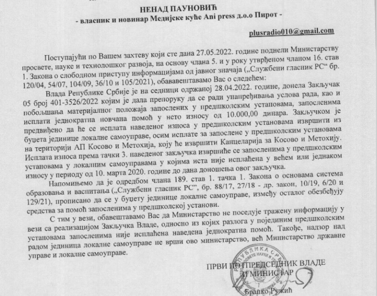 Danas smo dobili odgovor i iz Ministarstva prosvete, nauke i tehnološkog razvoja, koji prenosimo u celosti: