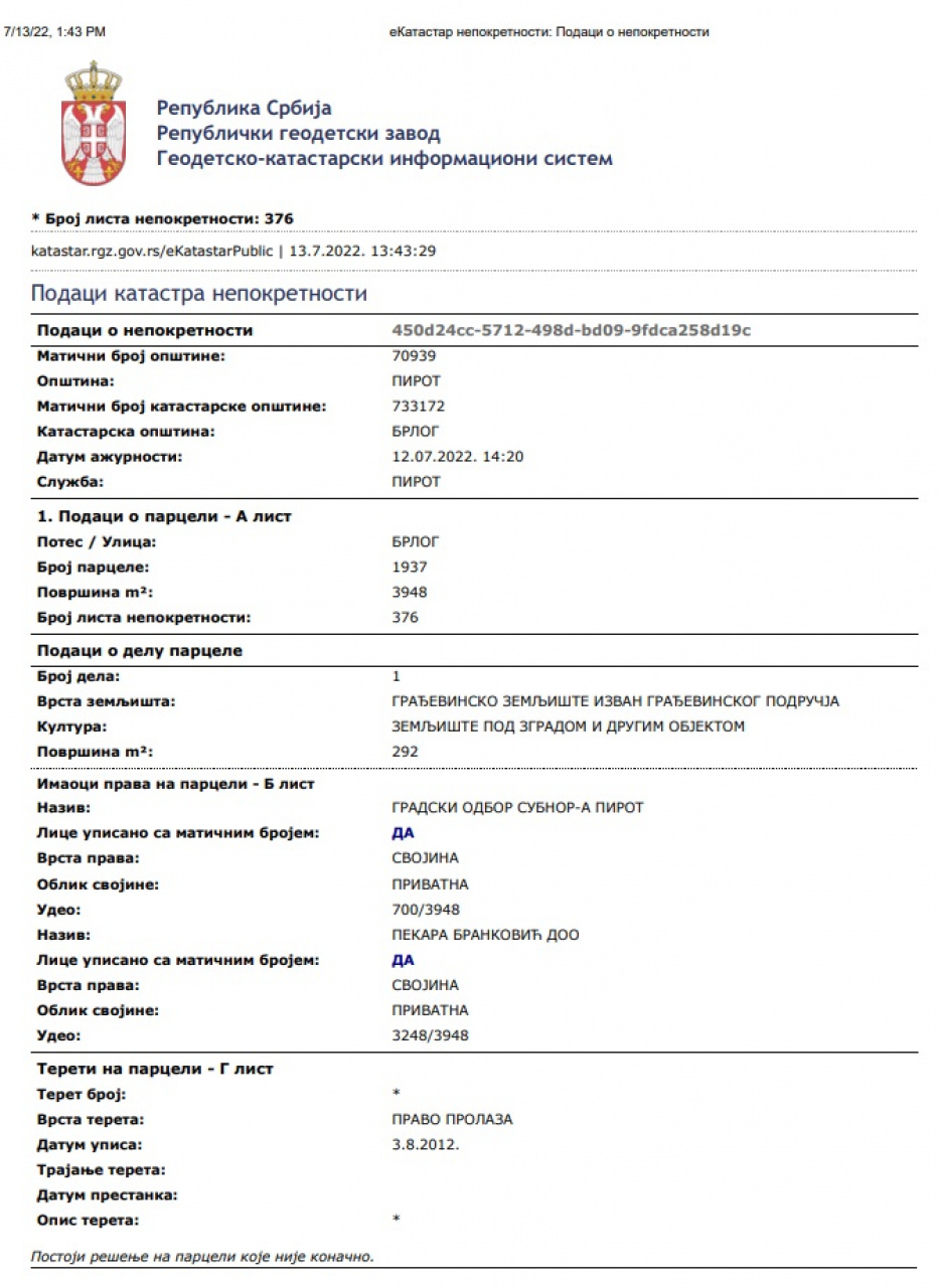 Pre svega, netačni su navodi izneti u tekstu koji se odnose na katastarsku parcelu 1937 KO Brlog na kojoj je i sporna ulazna staza iz pravca spomen doma da ista nije u vlasništvu Pekare Branković. Parcela je ukupne površine 3948m2 od kojih je 3248m2 u vlasništvu Pekare Branković doo što se može i utvrditi iz lista nepokretnosti. Ovaj deo placa je dakle privatna svojina Pekare Branković, a tabla na kojoj samo informisemo setace da su na privatnom posedu i molimo ih za postovanje privatnosti nalazi se na nasem delu placa.