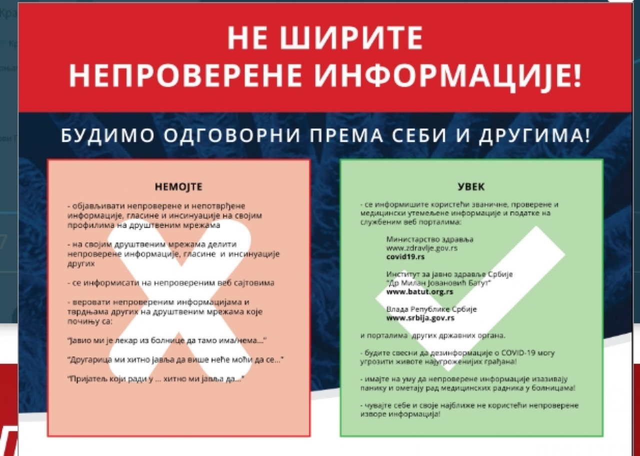 Vlada Srbije odredila je Zaključkom koji je usvojila je 28. marta da se obaveštenja o preduzetim zdravstvenim merama i drugim informacijama koje se odnose na lečenje COVID-19 date od strane neovlašćenih lica ne mogu smatrati tačnim i proverenim
