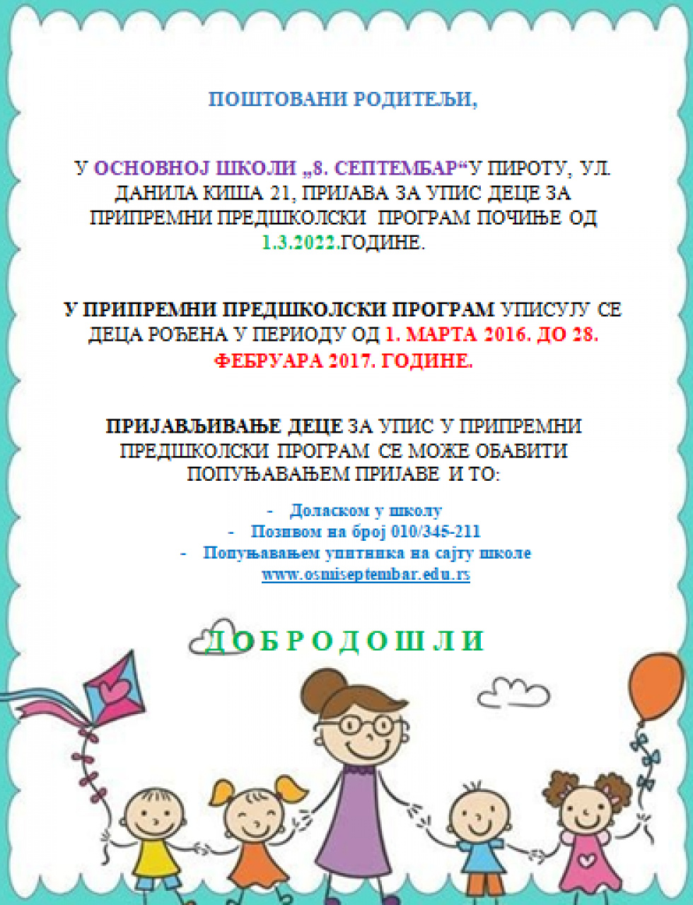 Pre par dana počeo je upis prvaka u OŠ "8.septembar" koji je moguć putem telefona 010/345-211, svakog radnog dana od 8:00 do 18:00 časova, lično ili putem mejla osmiseptembarpirot@gmail.com kao i preko Portala eUprava putem usluge eZakazivanje (https://euprava.gov.rs)