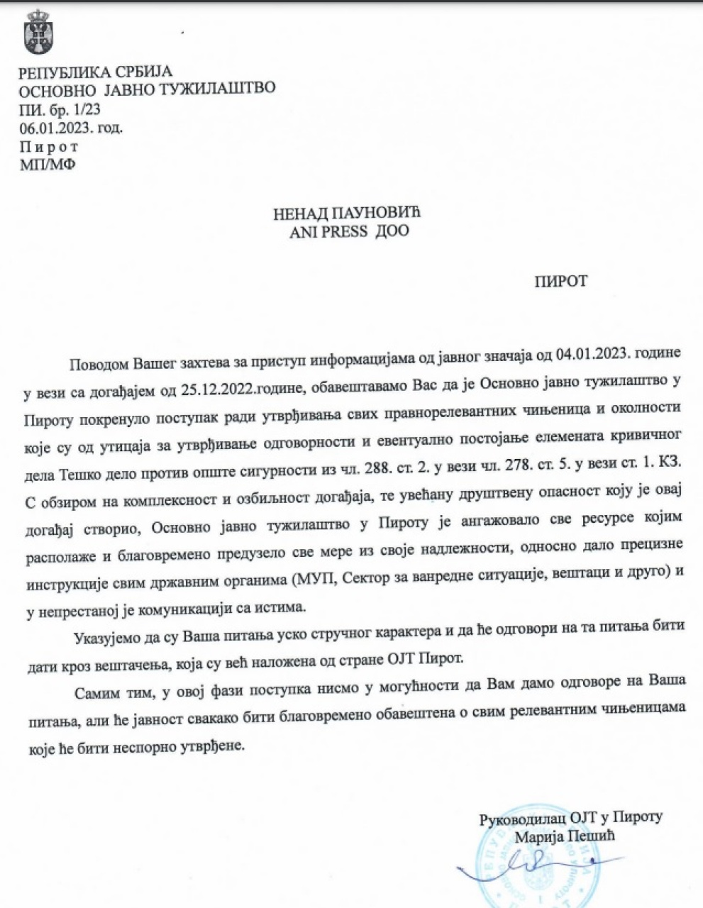 Osnovno javno tužilaštvo Pirot: Utvrđuje se odgovornost postojanja elemenata krivičnog dela protiv opšte sigunosti iz čl. 288 st. 2 u vezi čl. 278.st.5 Krivičnog zakona!