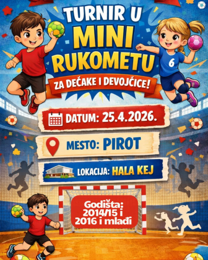 24. apr 2026. 10:42 ŽRK Pirot i ORK Pirot organizuju Turnir u mini rukometu u subotu 25.04.2026. godine od 9 do 15 u hali Kej.Dolazi 12 ekipa devojčica i dečaka iz sledećih mesta: Prokuplje, Niška banja, ... -