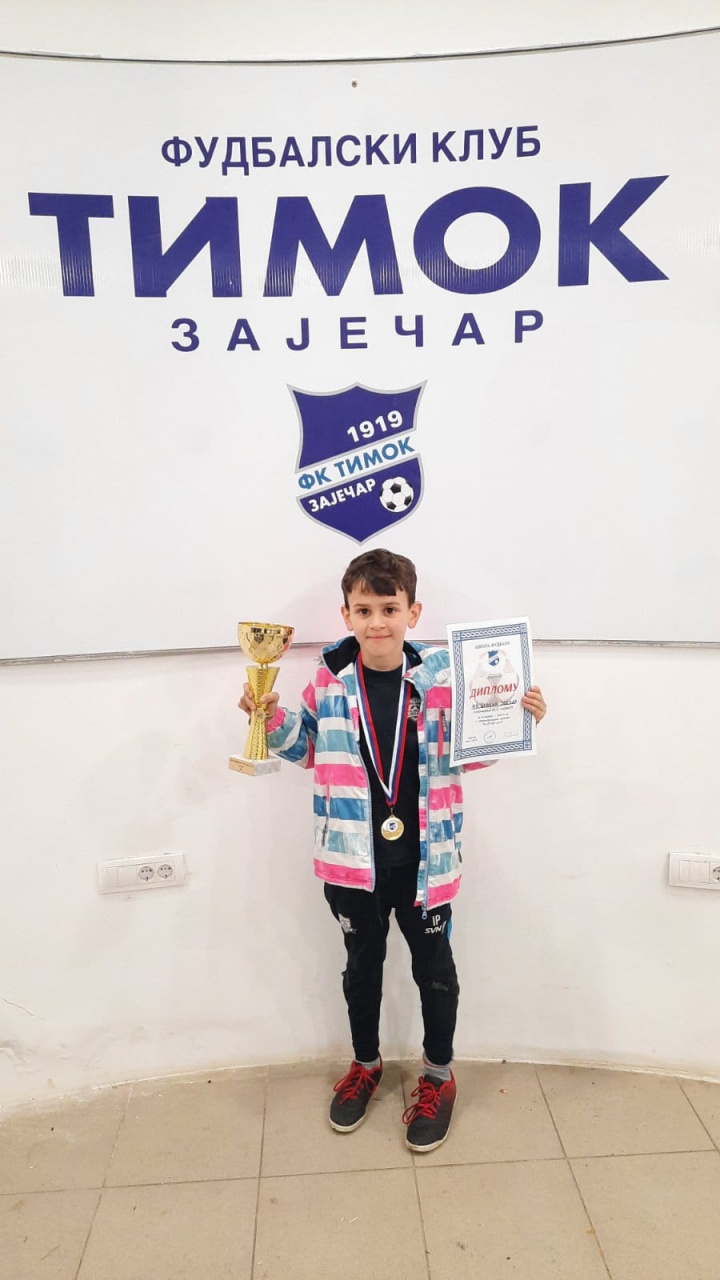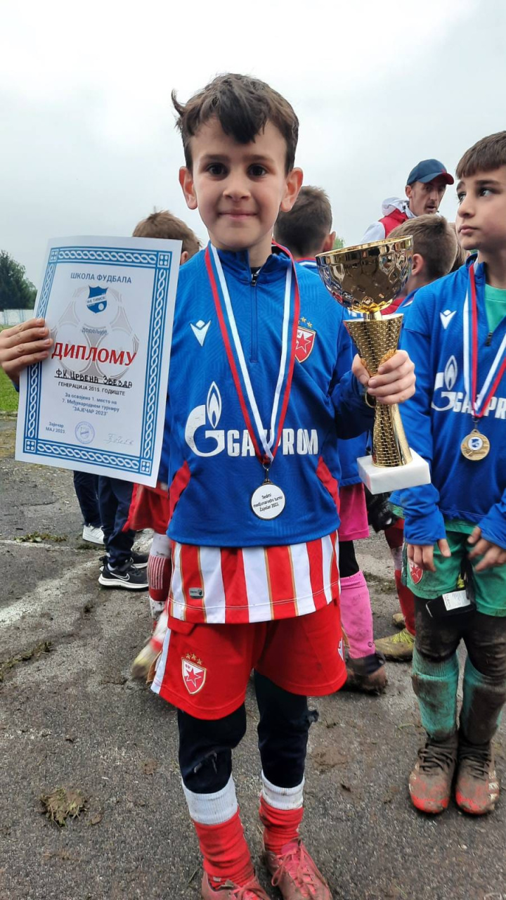 Dobre igre u Fair play ligi za ekipu FK Radnički Niš sa kojima naša škola ima odličnu saradnju, nisu promakle skautima Crvene zvezde i Ilija je dva dana proveo u Beogradu, a juče je imao čast da odigra i prvi turnir u crveno belom dresu. Ilija je na 6 utakmica na turniru postigao i 3 pogotka ,od kojih jedan u finalu i kao nagradu za dobre igre na turniru trener zvezdine generacije 2015 godište Mirko Lazić poklonio je Iliji trofej koji su osvojili.
