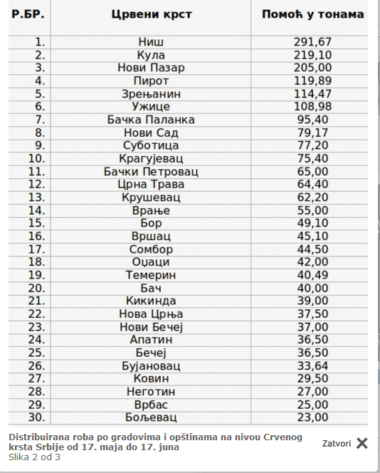 Prema podacima koji su navedeni u saopštenju Crvenog krsta Srbije Organizacija Crvenog krsta u Nišu je ugroženima od poplava distribuirala ubedljivo najviše pomoći na nivou Crvenog krsta Srbije. Količina od 292 tone pomoći otpremljene u periodu od 17. maja do 17. juna, Niš je stavila na prvo mesto liste od 30 opština i gradova iz kojih je roba slata ugroženima. Slede Kula (219 tona), Novi Pazar (205 tona), Pirot (119 tona) i Zrenjanin (114 tona). Novi Sad je, na primer, sa 79 tona poslate pomoći, na 8. mestu ove liste, a Kragujevac, sa 75 tona, na desetom. Distribuirana roba po gradovima i opštinama na nivou Crvenog krsta Srbije od 17. maja do 17. juna