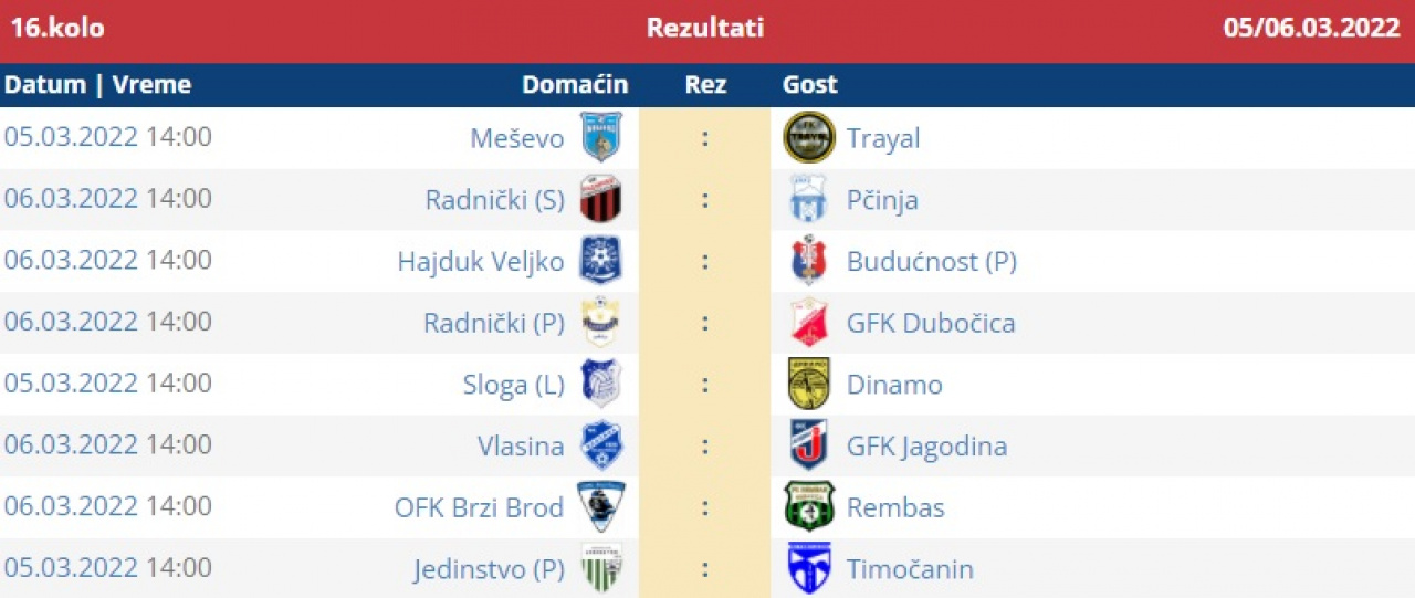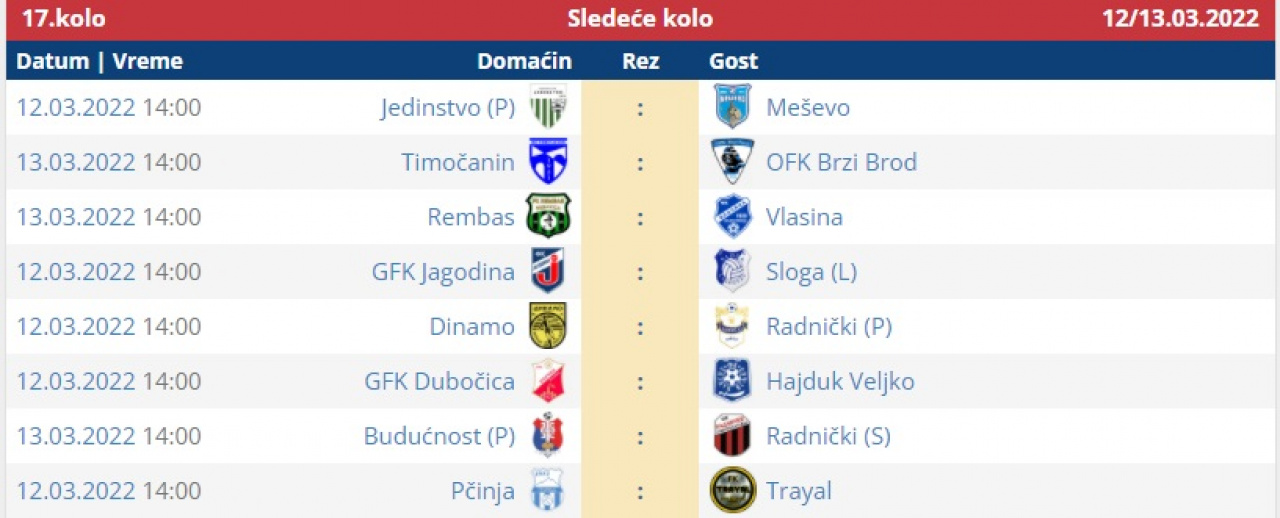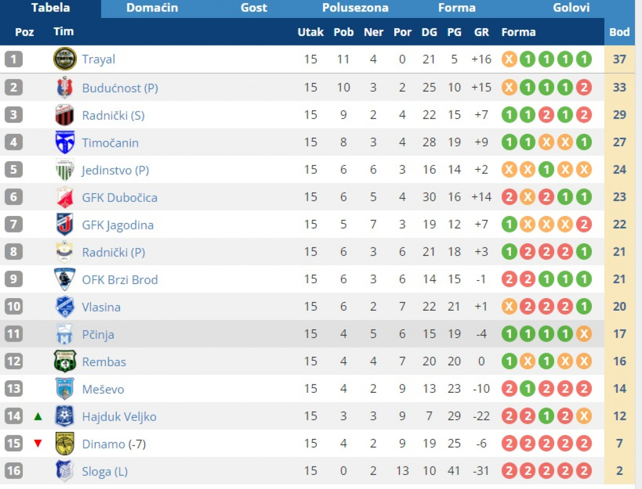 23. nov 2025. 18:32 Srpska liga Istok, 15. koloStadion "Dragan Nikolić"Pirot: Radnički - Timok (Zaječar) 1:2 (1:2)Radnički: Ristić, Antić, Tanasijević, Petrov, Mladenović, Ristov, S. Stanković, Dušanić (... -