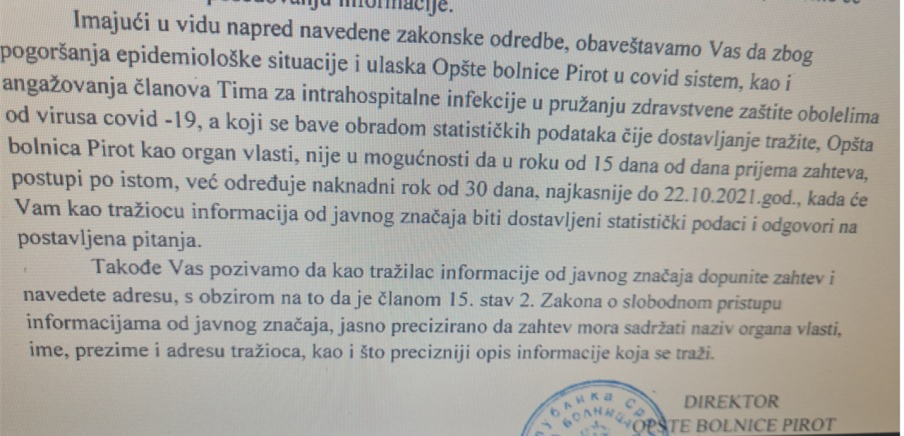 Neverovatno, kako vreme brzo prolazi. Dr Goranu Petroviću, direktoru Opšte bolnice Pirot, poslali smo 15. septembra pitanja, pozivajući se na zakon o dostupnosti informacija. Bilo je to vreme posle smrti dve tek rodjene bebe, ali i u vreme brojnih primedbi naših sugradjana. Podsetili smo da bi odgovori po Zakonu trebalo da budu poslati za osam dana.