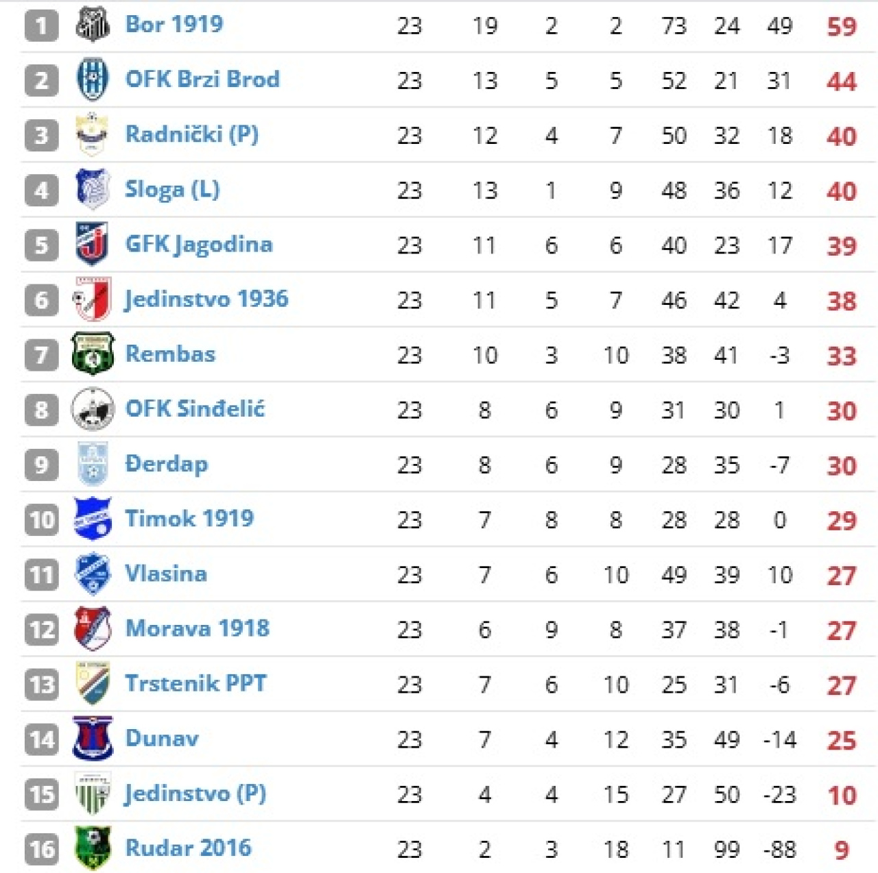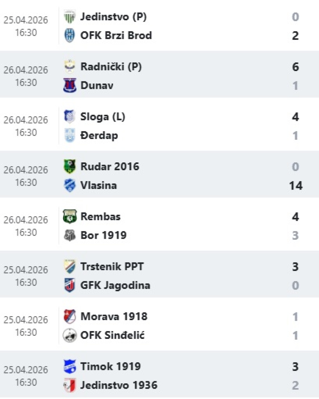 26. apr 2026. 20:45 Srpska liga Istok, 23. koloStadion "Dragan Nikolić"Pirot: Radnički - Dunav (Prahovo) 6:1 (4:0)Radnički: Ristić, Antić, Nedeljković, Tanasijević, Stojanović (Stanković), Mladenović, Vojinović, Ristov (... -