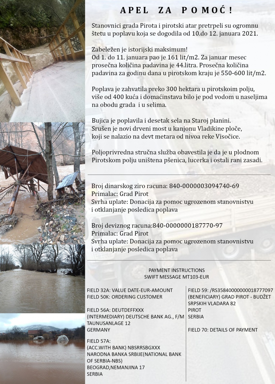 Stanovnici grada Pirota i pirotski atar pretrpeli su ogromnu štetu u poplavi koja se dogodila od 10.do 12. januara 2021.