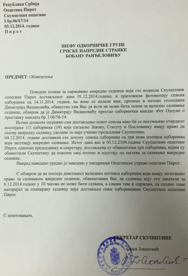U petak u večernjim časovima upućeno je dodatno pismo Bobanu Ranđeloviću. šefu Odborničke grupe SNS-a.