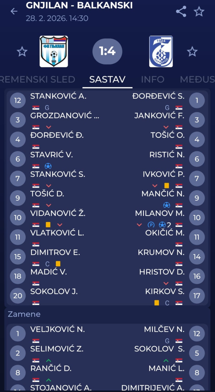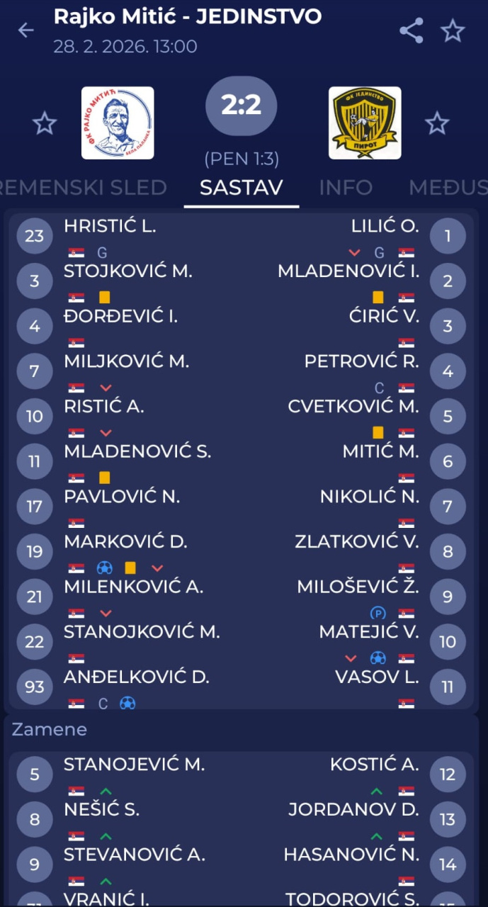 26. apr 2026. 20:45 Srpska liga Istok, 23. koloStadion "Dragan Nikolić"Pirot: Radnički - Dunav (Prahovo) 6:1 (4:0)Radnički: Ristić, Antić, Nedeljković, Tanasijević, Stojanović (Stanković), Mladenović, Vojinović, Ristov (... -