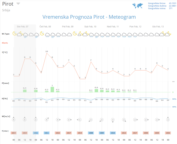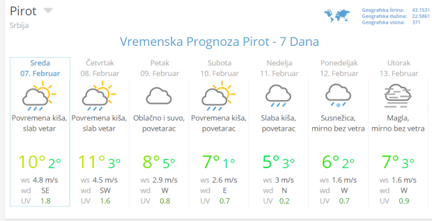 Za dane vikenda pretežno oblačno, na severu suvo, u ostalim krajevima u subotu sa kišom, u planinama sa snegom, a u nedelju sneg se očekuje i u nižim predelima, zatim suvo uz delimično razvedravanje i postepeni porast temperature, samo krajem perioda ponegde slaba kiša.
