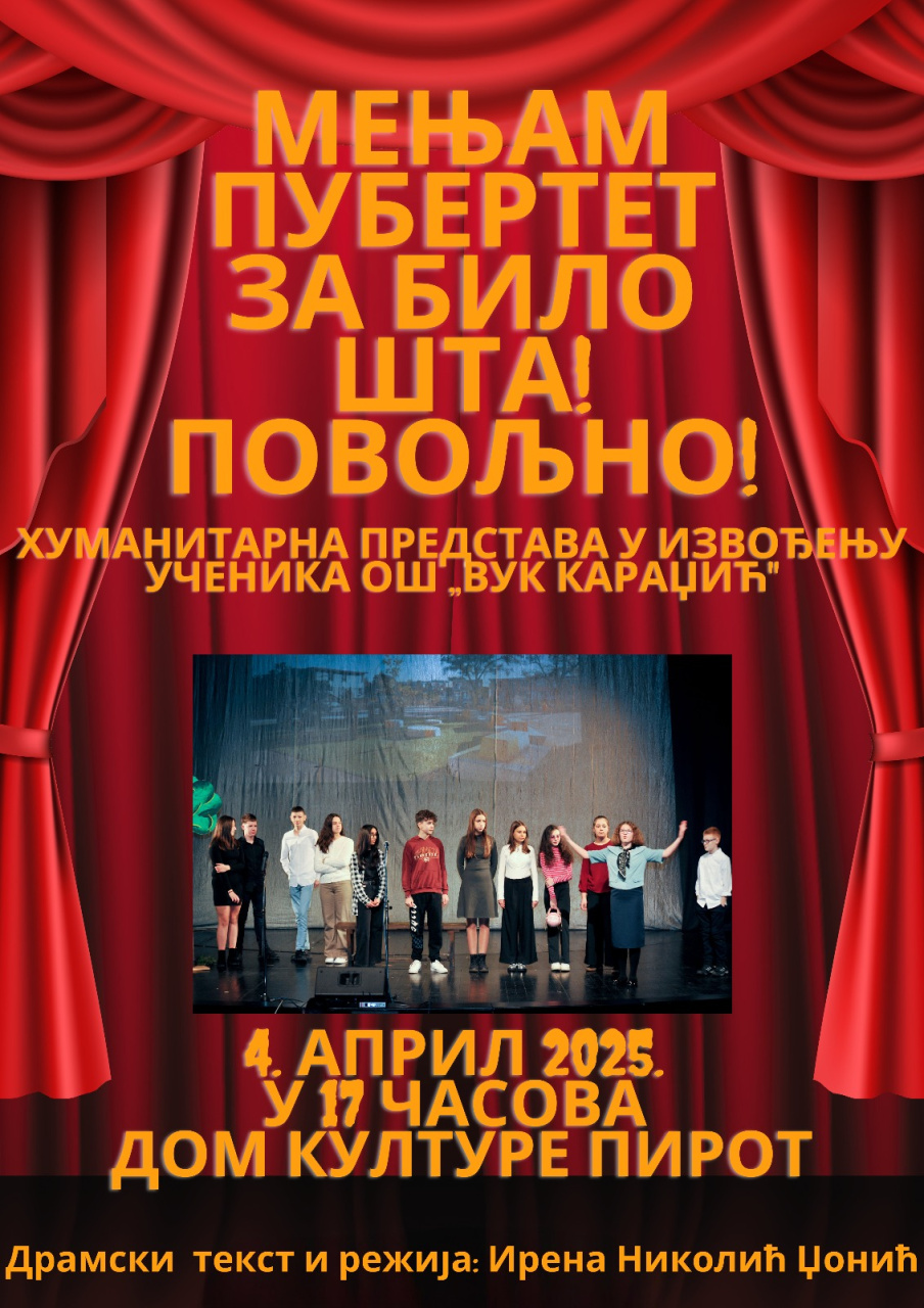 Humanitarna predstava "Menjam pubertet za bilo šta! Povoljno!", u izvođenju učenika starijih razreda OŠ "Vuk Karadžić" biće prikazana u Domu kulture, u petak, 4.4. 2025. u 17 časova.