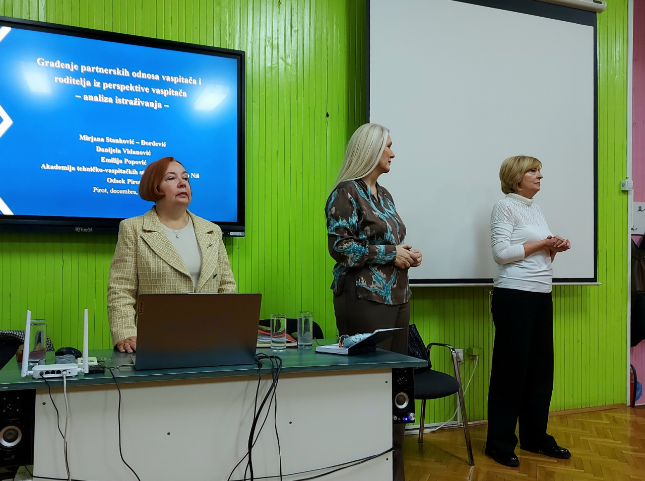 Profesorke Akademije tehničko-vaspitačkih strukovnih studija, Odsek Pirot, dr Mirjana Stanković Đorđević, dr Danijela Vidanović i dr Emilija Popović, sprovele su prošle godine istraživanje sa vaspitačima o doživljaju partnerstva sa roditeljima u svetlu Novih osnova programa „Godine uzleta“. Večeras je u prostorijama Odseka Pirot održana prezentacija rezultata istraživanja.