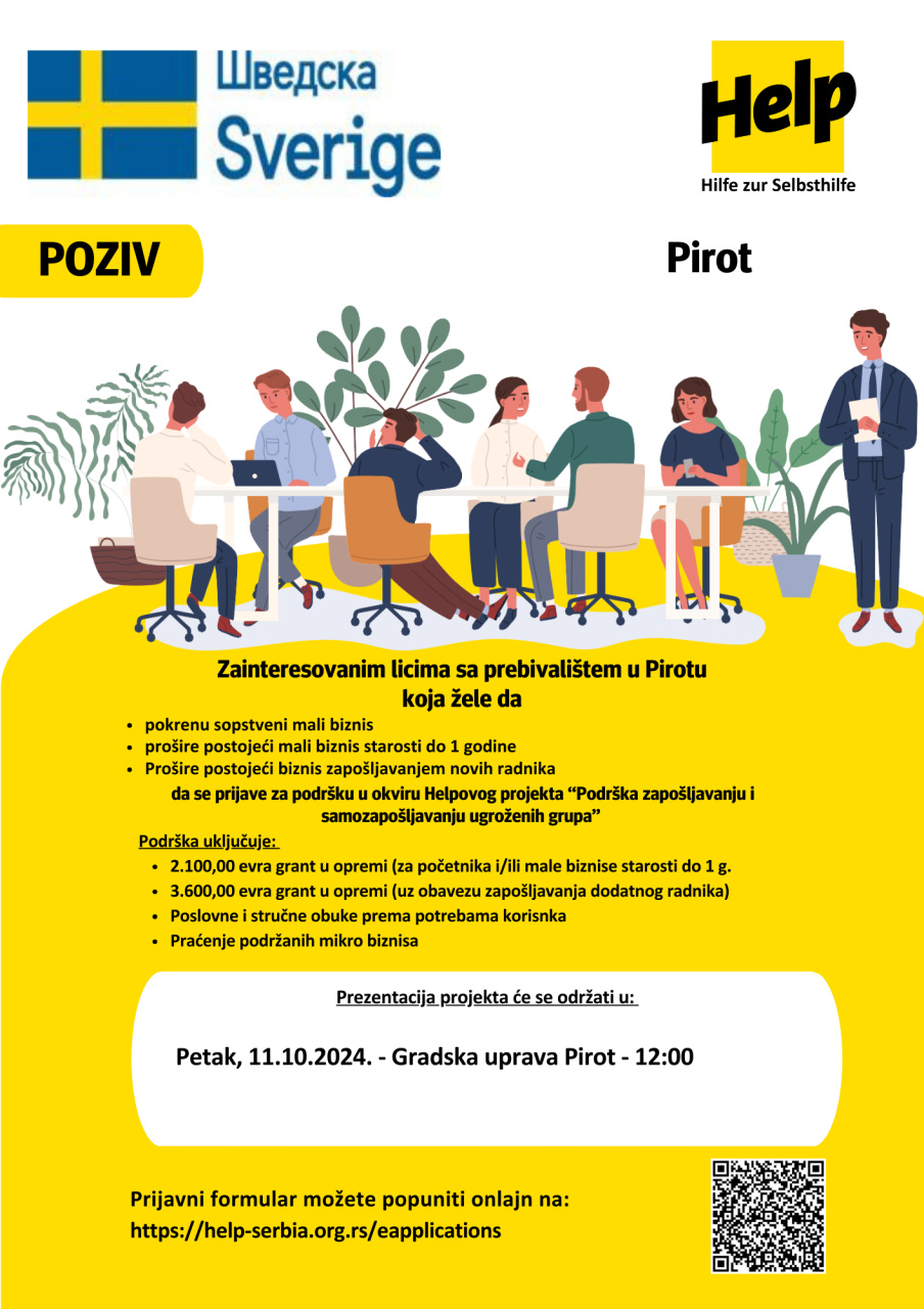 U petak 11. oktobra 2024. godine, u 12:00 časova, u Gradskoj upravi Pirota, za sve zainteresovane sa prebivalištem na teritoriji Grada Pirota biće održana prezentacija projekta „Pomoć pri zapošljavanju i samozapošljavanju ugroženih grupa“, koji finansira Švedska vlada preko Švedske agencije za međunarodni razvoj i saradnju „Sida“ i Grad Pirot.