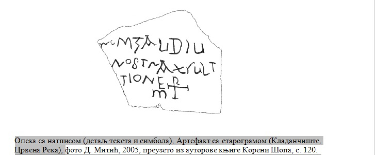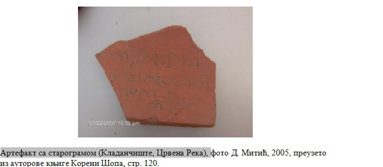 Fragment krovne opeke (tegula) od crvene gline sa lokaliteta Kladančište kod Crvene Reke nosi urezan latinski natpis i simbol u obliku mača/krsta.