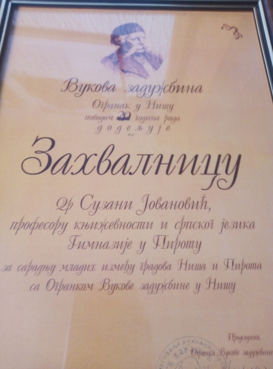 U petak, 25. juna, u zgradi Banovine u Nišu, Ogranak Vukove zadužbine u Nišu, profesorki srpskog jezika i književnosti Gimnazije Pirot, dr Suzani Jovanović, uručena je Zahvalnica povodom 20 godina lepe i uspešne saradnje sa Vukovom zadužbinom.