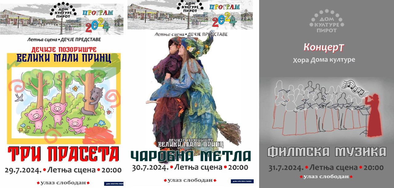 -Ponedeljak, 29.07. 2024. god. od 20:00 sati na letnjoj sceni – dečija predstava „Tri praseta“;