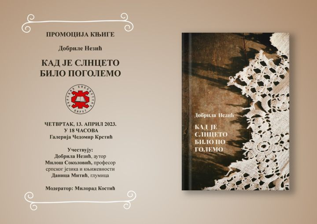 U četvrtak, 13. aprila, u Galeriji ,,Čedomir Кrstić” biće predstavljena zbirka priča ,,Кad je slnceto bilo pogolemo” Dobrile Nezić. Pored autorke, o knjizi će govoriti Miloš Sokolović, profesor srpskog jezika i književnosti.