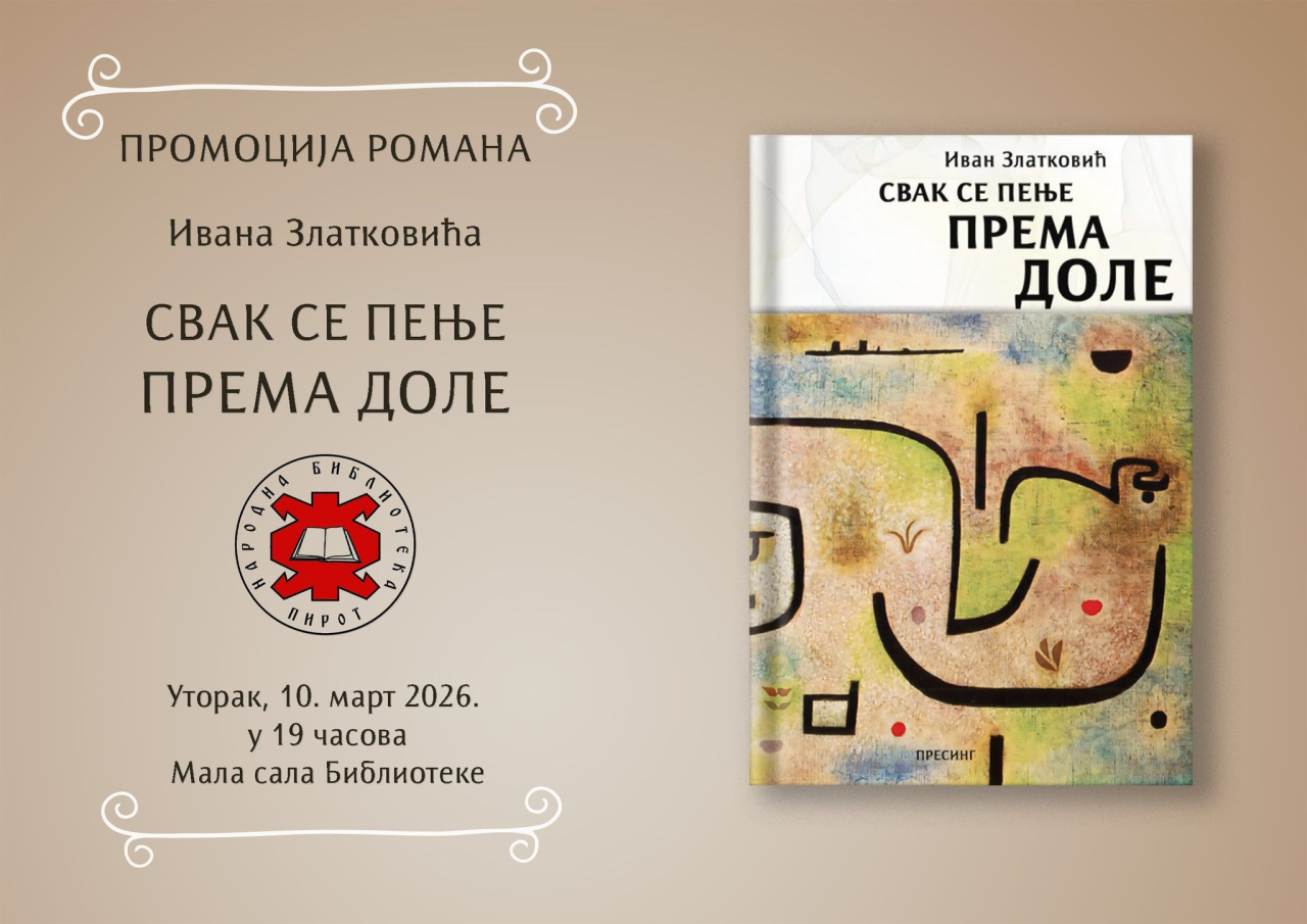 U Narodnoj biblioteci Pirot, u utorak, 10. marta, biće održana promocija najnovijeg romana Ivana Zlatkovića „Svak se penje prema dole” (Presing, 2025). Promocija je zakazna za 19 sati u Maloj sali Biblioteke.