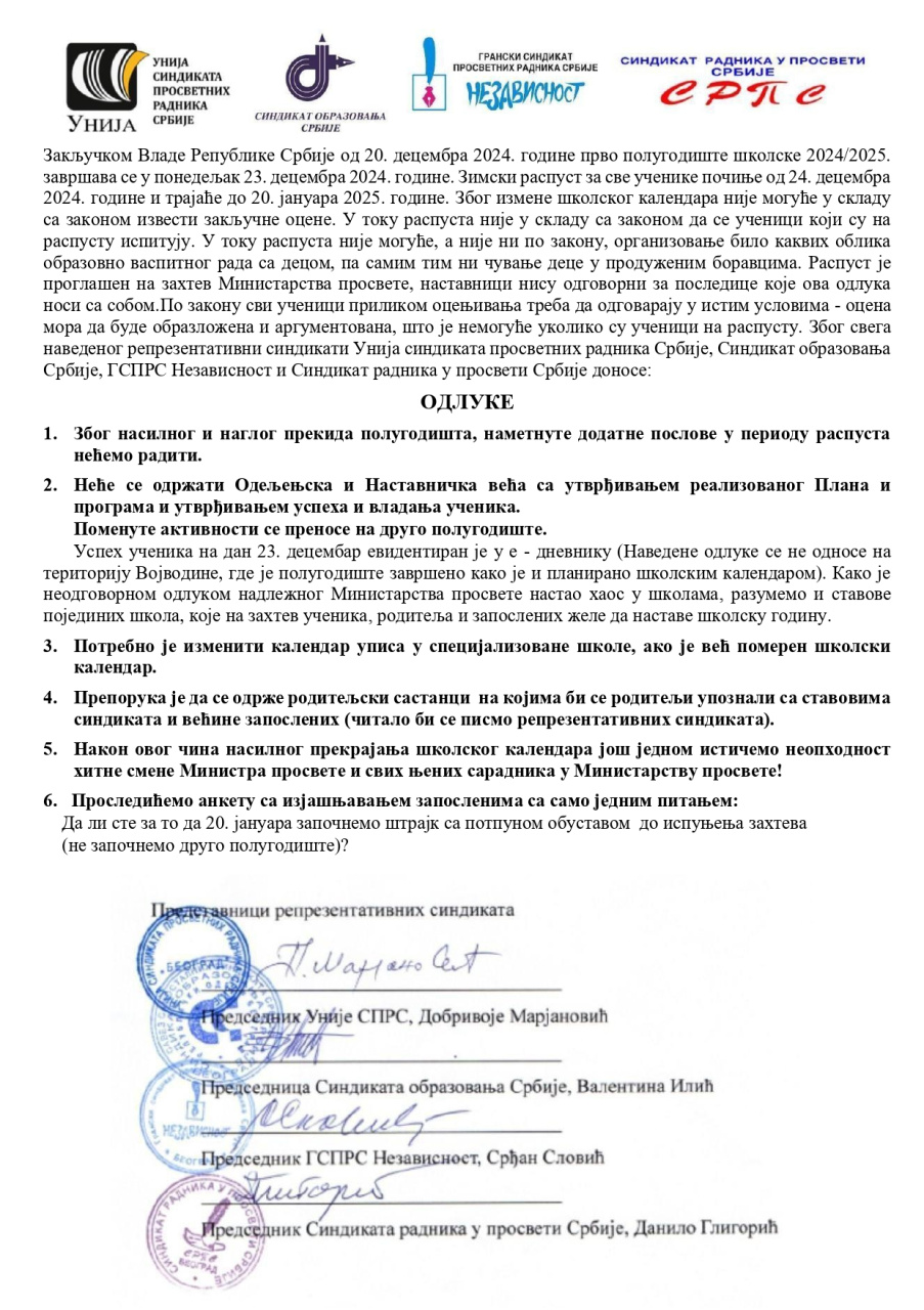 Reprezentativni sindikati Unija sindikata prosvetnih radnika Srbije, Sindikat obrazovanja Srbije, GSPRS „Nezavisnost“ i Sindikat radnika u prosveti Srbije saopštili su da da zbog odluke Vlade Srbije da se prvo polugodište završi u ponedeljak, 23. decembra, završne ocene neće moći da budu zaključene, i da zbog toga neće biti održana odeljenska i nastavnička veća.