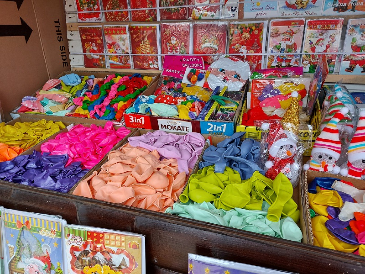 Čestitke koštaju od 30 do 80 dinara, ukrasi su od 10 dinara, pa naviše, prskalice 60 dinara, a baloni od 10 do 60 dinara.