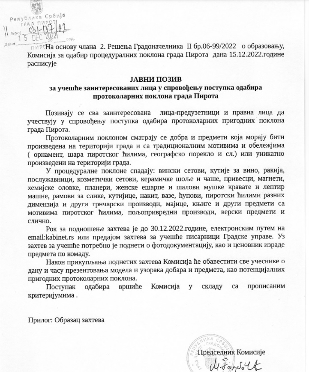 Komisija za odabir proceduralnih poklona grada Pirota 15. 12.2022. raspisala Javni poziv za učešće zainteresovanih lica u sprovođenju postupka odabira protokolarnih poklona grada Pirota.