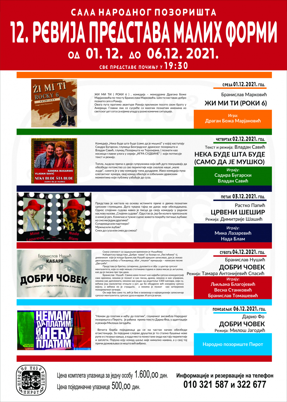 Prva predstava je na programu 1. decembra - monodrama “Živ mi ti” koju igra Dragan Boža Marjanović, druga predstava je 2. decembra - “Neka bude šta bude samo da je muško”, uloge tumače Sandra Bugarski i Dragan Savić, treća predstava je 3. decembra - “Crveni šešir”, igraju Mina Lazarević i Nada Blam, četvrta predstava je 4. decembra - “Dobri čovek”, igraju Ljiljana Blagojević, Vesna Stanković i Branislav Tomašević. Poslednja predstava je 6. decembra - “Neću da platim i ne mogu da platim” Ansambla Narodnog pozorišta Pirot.
