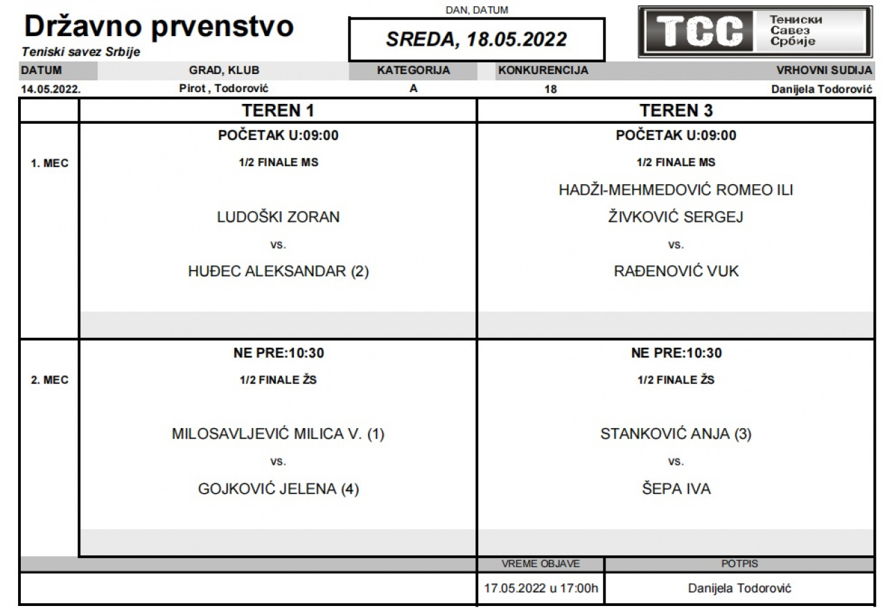 Sutra sreda, 18. maj, na programu su polufinalni mečevi
