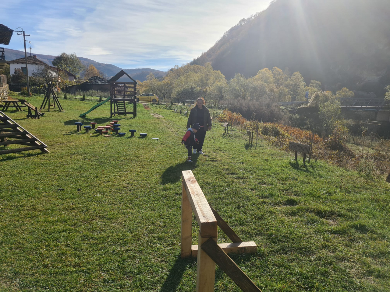 Majka sa detetom. Tu je i jedna starija žena, koju sam kasnije vidjao svuda gde sam prošao. Kao čuvar! Neko ko je tu da namernicima kaže po koju lepu reč, uputi ih. Interesantan detalj pored igraonice. Napravljene drvene ploče na kojima su nadimci svih “pkleških” familija.