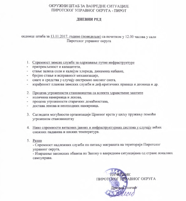 Za ponedeljak 13. novembra zakazana je sednica Okružnog štaba za vanredne situacije Pirotskog upravnog okruga. Na dnevnom redu sednice je razmatranje spremnosti zimske službe za održavanje putne infrastrukture, procena ugroženosti stanovništva sa aspekta zdravstvene zaštite kao i sagledavanje mogućnosti Crvenog krsta za pružanje pomoći ugroženom stanovništvu. Članovi Štaba razmatraće i nivo spremnosti vitalnih javnih i infrastrukturnih sistema u slučaju većih padavina i niskih temperatura. Pod tačkom Razno razmatraće se pitanje spremnosti nadležnih službi kada je reč o migrantima i izvršenje zakonskih obaveza po Zakonu o vanrednim situacijama od strane lokalnih samouprava.