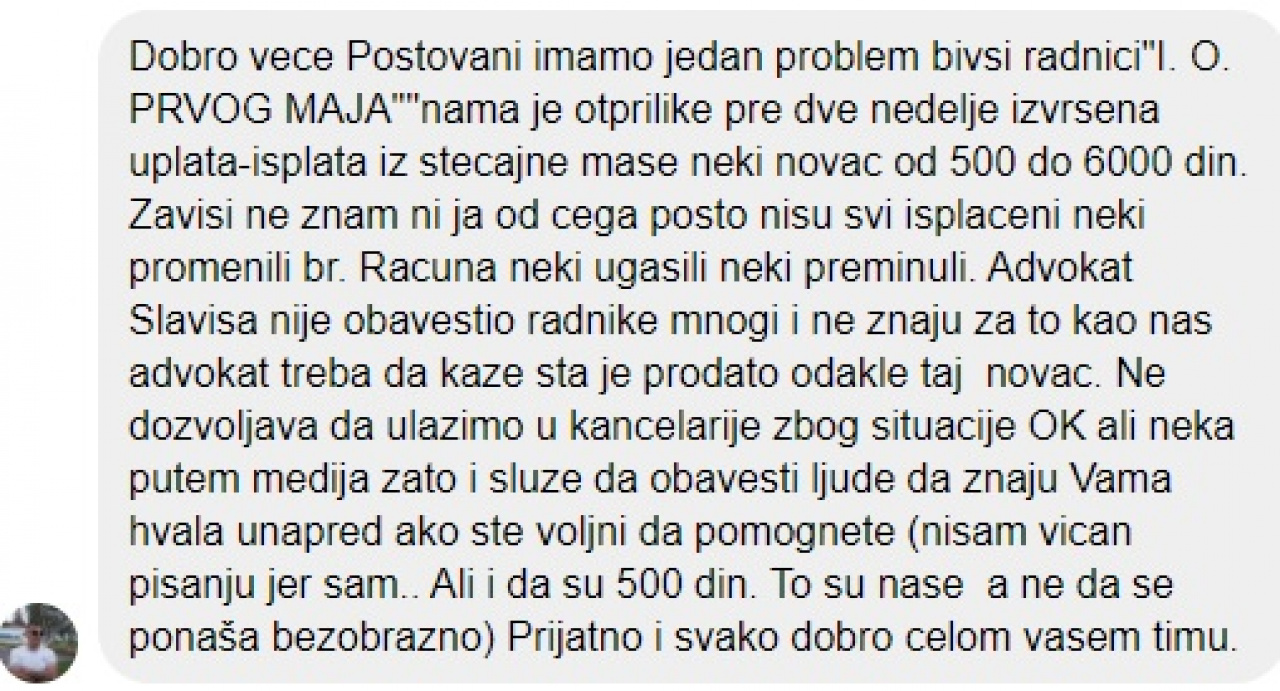Dragi bivši radnici Prvog maja, dogovorili smo sa advokatom Stamenovićem, da na našem Portalu objavljujemo sve informacije koje su značajne za vas, a tiču se predmeta koje radi.