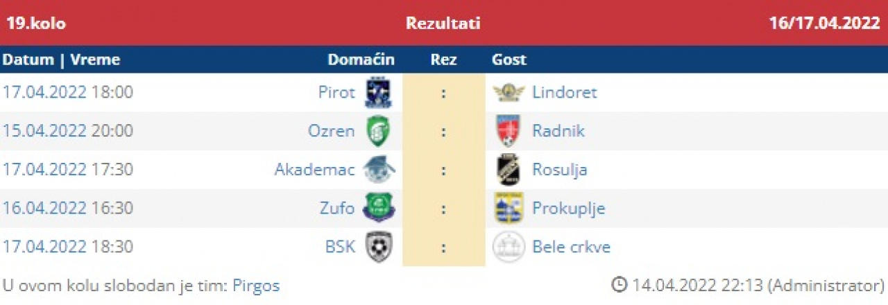 18. apr 2026. 13:36 Srpska liga Istok, 22. koloPonedeljak, 20. april, 16:30Paraćin: Jedinstvo - RadničkiNa zahtev domaćina da se utakmica pomeri za ponedeljak, Stručni štab Radničkog, kao pravi sportski ... -
