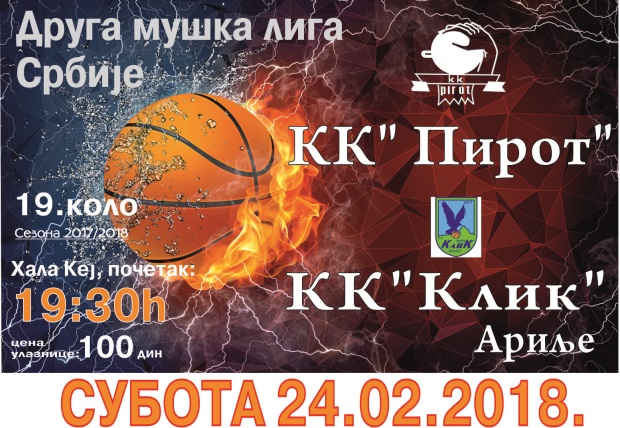 Košarkaši Pirota u 19.kolu Druge lige dočekuju Klik iz Arilja. Meč se igra u Hali Kej u subotu 24.februara od 19:30 minuta.