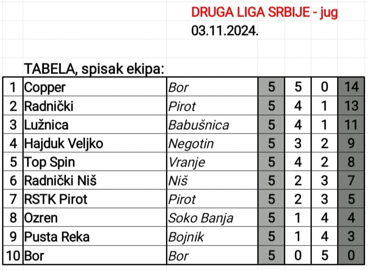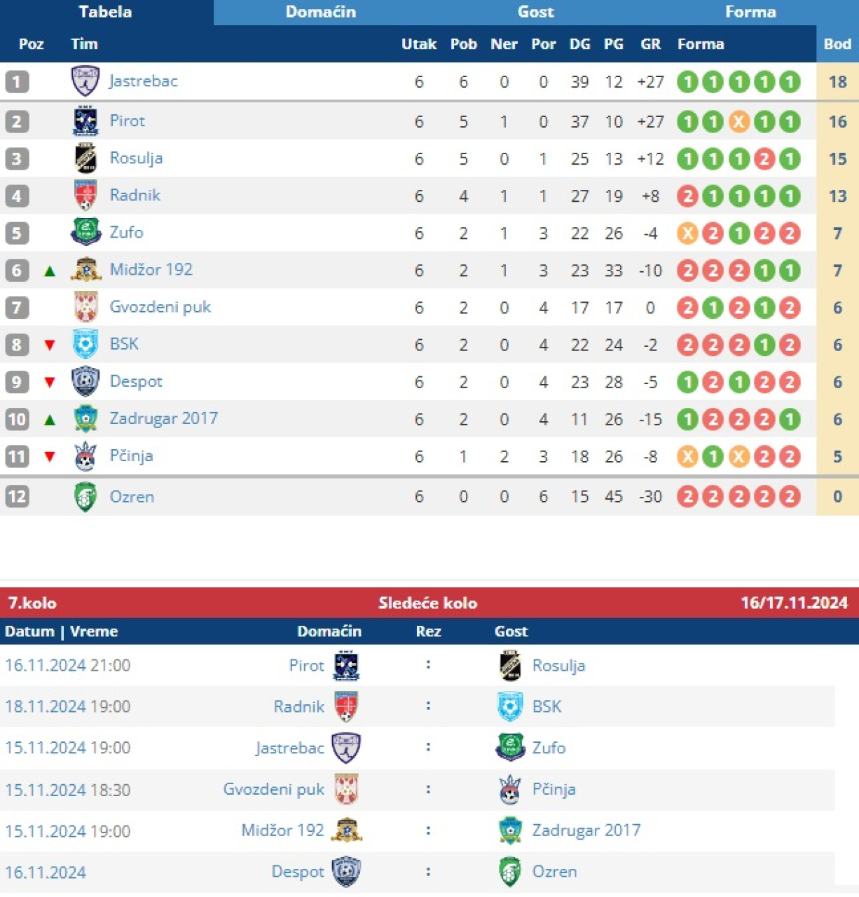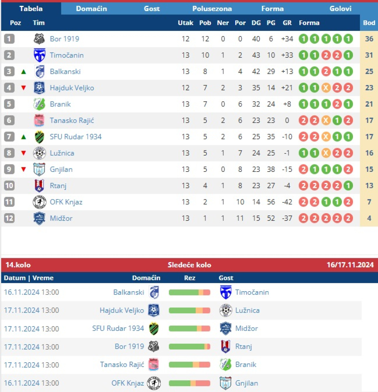 26. okt 2025. 18:11 Srpska liga Istok, 11. koloStadion "Dragan Nikolić"Pirot: Radnički - Bor 1919 1:3 (0:2)Radnički: Mirković, Nedeljković, Petrov, Mladenović, Vojinović, Dušanić, Đorđević, N. Petrović, M. ... -