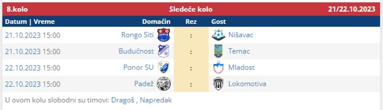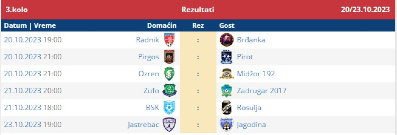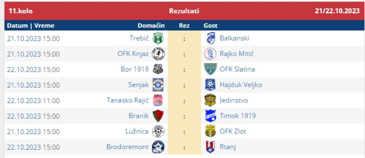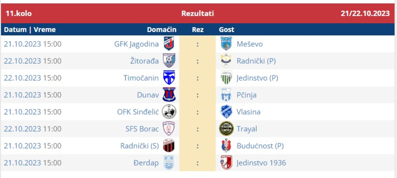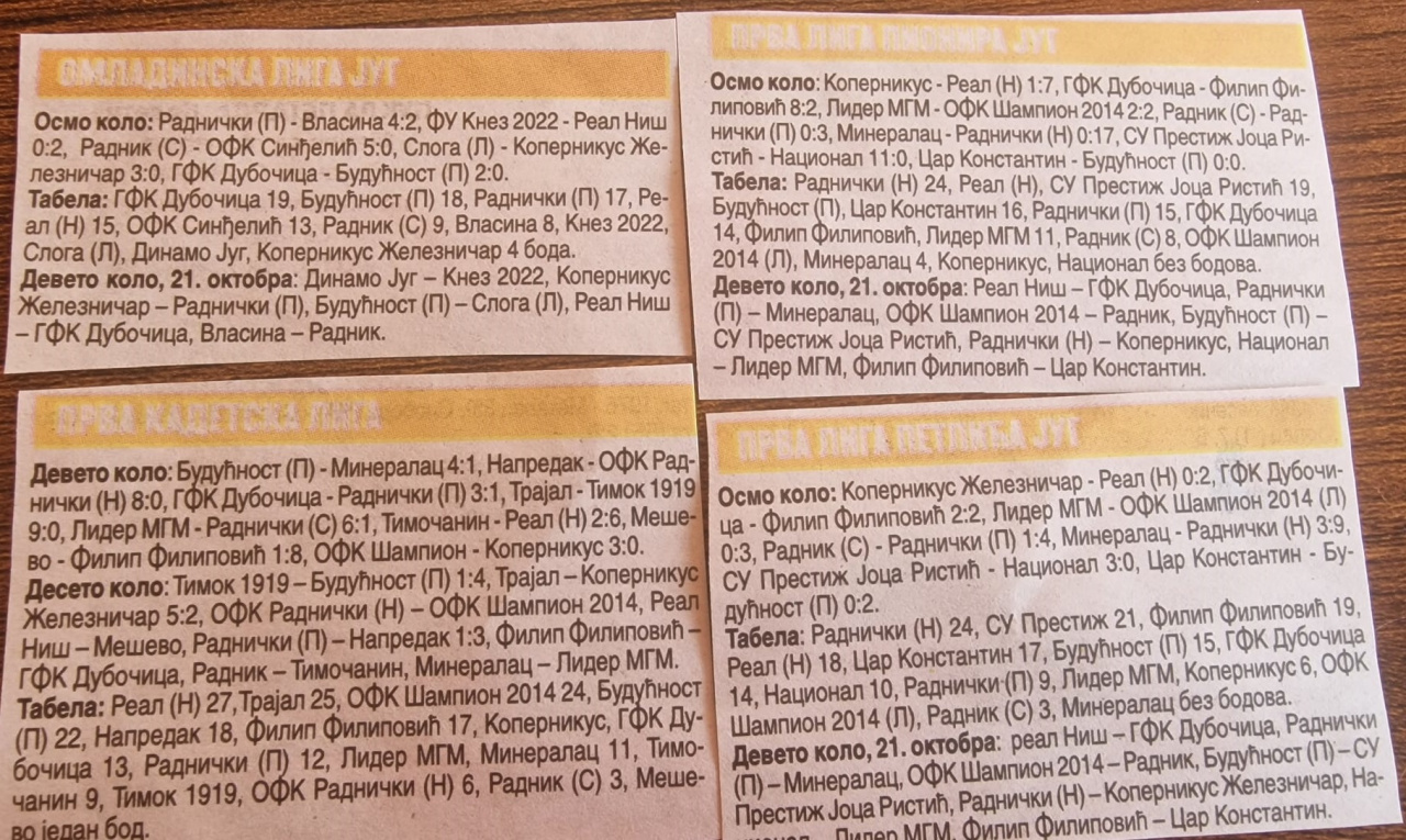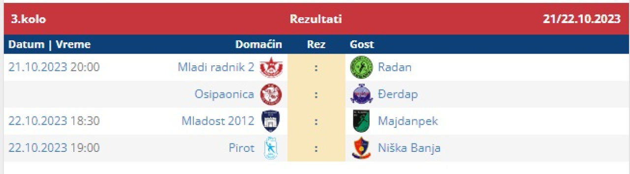 14. apr 2026. 17:45 Omladinska liga FS RIS, 22. koloPomoćni teren Stadiona "Dragan Nikolić"Pirot: Radnički - Radnički (Niš) 1:2 (0:0)Radnički Pirot: Jovanović, D. Rančić, Mančić, Denčić, Aleksić, Nakov, Ćirić, Lu....