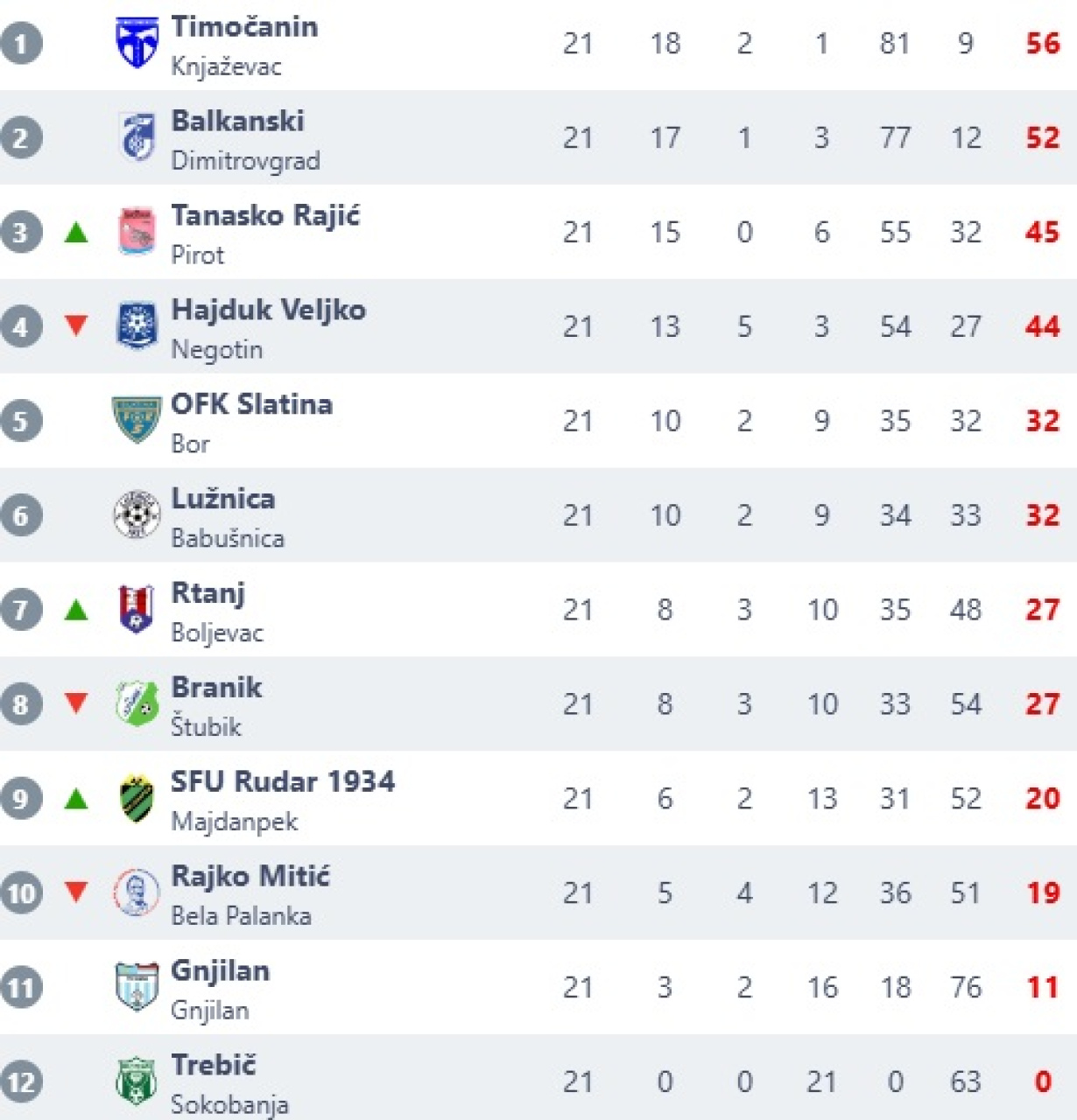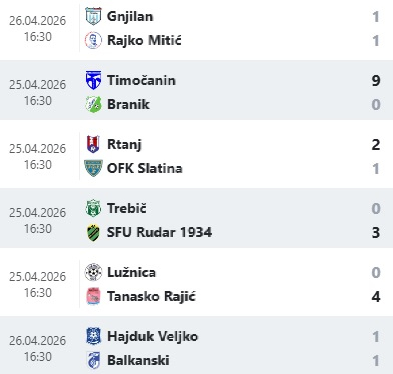 26. apr 2026. 20:45 Srpska liga Istok, 23. koloStadion "Dragan Nikolić"Pirot: Radnički - Dunav (Prahovo) 6:1 (4:0)Radnički: Ristić, Antić, Nedeljković, Tanasijević, Stojanović (Stanković), Mladenović, Vojinović, Ristov (... -