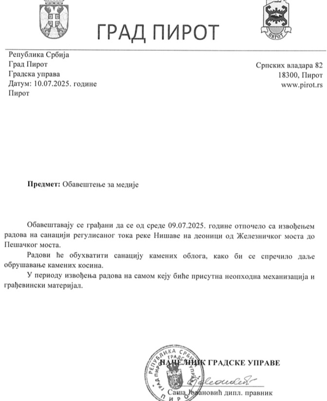 Obaveštavaju se građani da se od srede 09.07.2025. godine otpočelo sa izvođenjem radova na sanaciji regulisanog toka reke Nišave na deonici od Železničkog mosta do Pešačkog mosta.