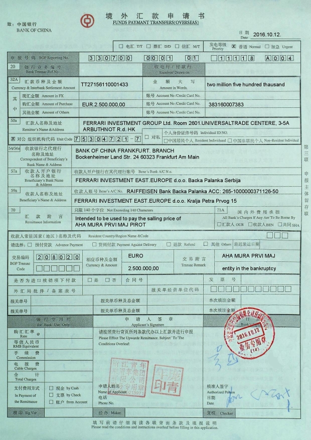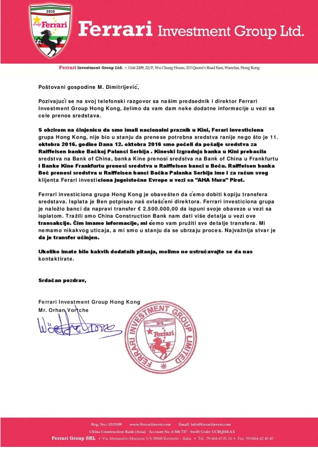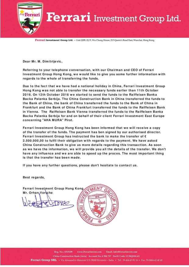 Medjutim, i posle odlaganja rokova za uplatu depozita na zahtev kupca, a uz odobrenje stečajnog upravnika na osnovu saglasnosti Odbora poverilaca, do uplate još uvek nije došlo. Tim povodom stečajni upravnik, Miroljub Dimitrijević, izjavio je za Portal Plus onlajn, da mu nije poznato zašto uplata kasni i posle svih prepiski sa “Ferarijem” i da planira da se u ponedeljak, 24. oktobra, obrati za pomoć Narodnoj banci Srbije.