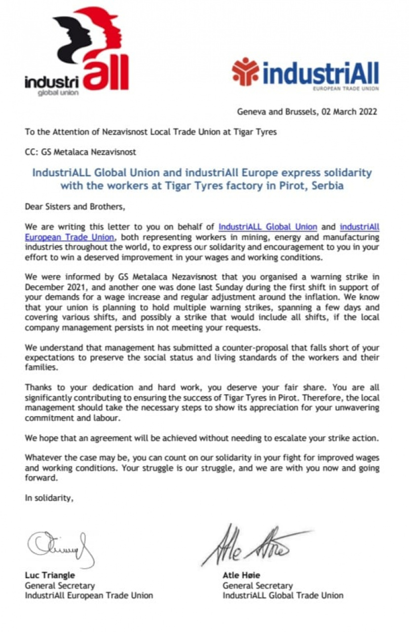 Pišemo vam ovo pismo u ime IndustriAll Global Union I IndustriAll Europe Trade Union, od kojih obe predstavljaju radnike u oblastima rudarstva, energetike i proizvodne industrije širom sveta, da bi izrazili našu solidarnost i podršku vašoj borbi za zasluženo povećanje plate i poboljšavanje uslova za rad.