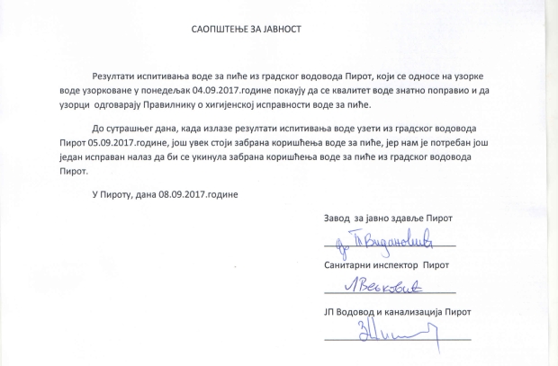 Pogledajte saopštenje! Potpisali su svi relevantni činioci, ali , s obuzirom na to da je neophodno da se analiza uradi dva puta, savet je da vodu, ipak , ako imate strpljenja i poštujete birokratske propise, i dalje u piljaru, ili na cistetrnu!