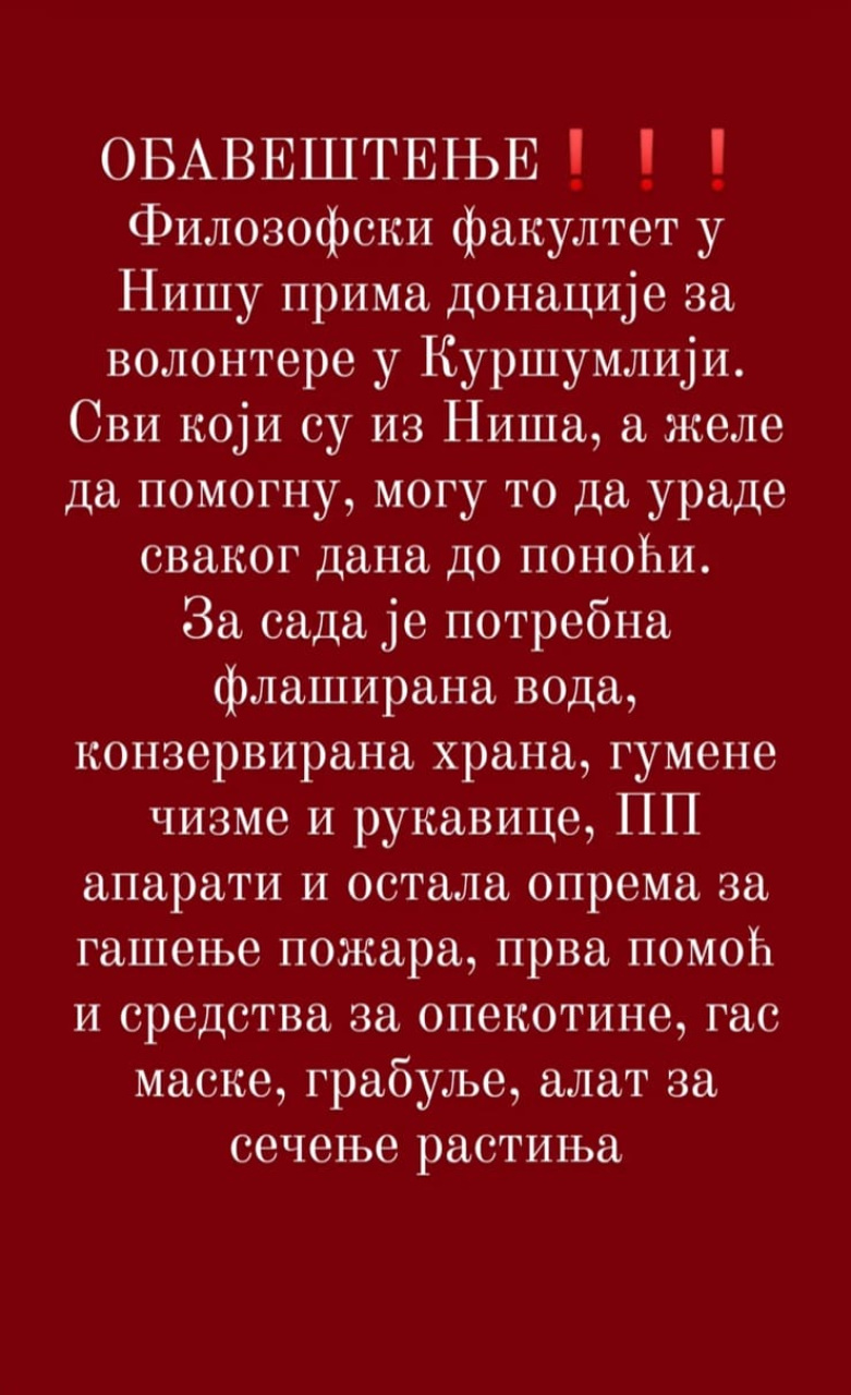 Studenti vas čekaju kod znaka Pirot. Humanitarna akcija za pomoć oštećenima u požaru! Danas do 13h i popodne od 17-19h!