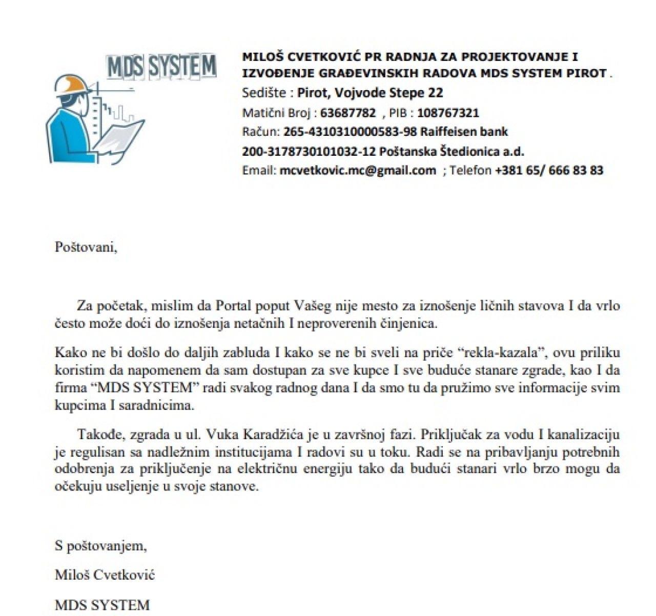 Sadržaj mejla poslali smo vlasniku MDS sistem i on je poslao odgovor: