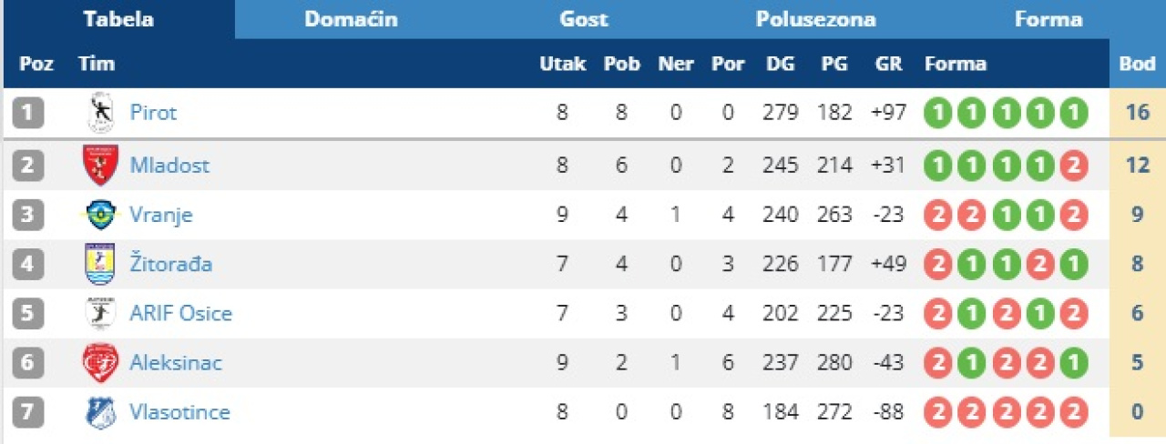 Potom sledi baraž. Ovo je tabela Grupe A. Pirot će kao prvoplasirani iz Grupe B, igrati sa drugoplasiranijm iz Grupe A.