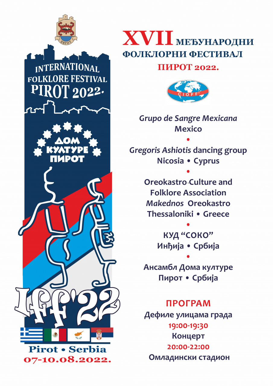 Od 07. do 10. avgusta 2022. godine pod pokroviteljstvom grada Pirot održaće se tradicionalni XVII FOLКLORNI FESTIVAL PIROT 2022. sa učešćem 5 ansambala: