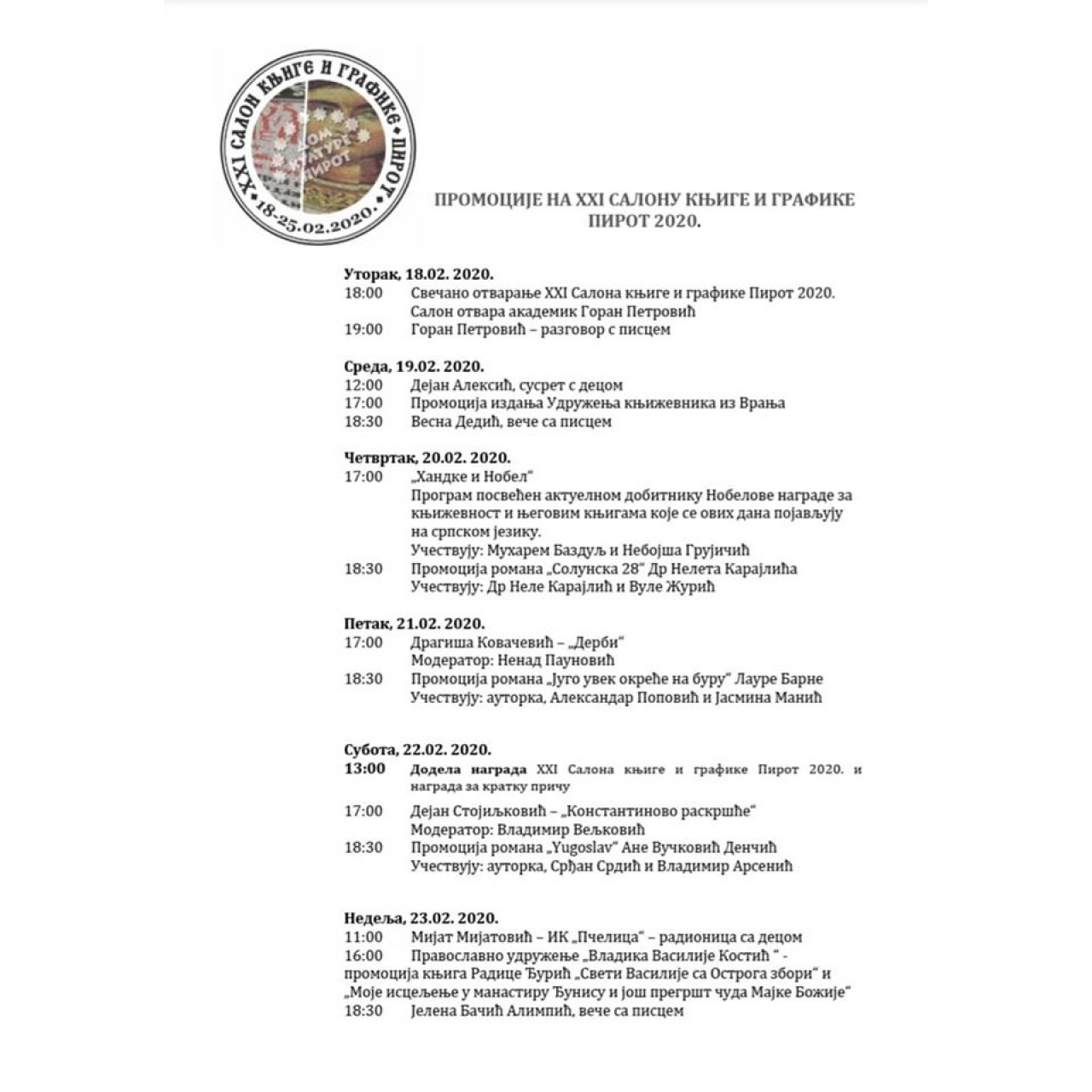 Ove godine sajam se održava od 18. do 25. februara. Organizatori su i za ovu godinu pripremili raznovrstan program za sve uzraste i poštovaoce pisane reči.