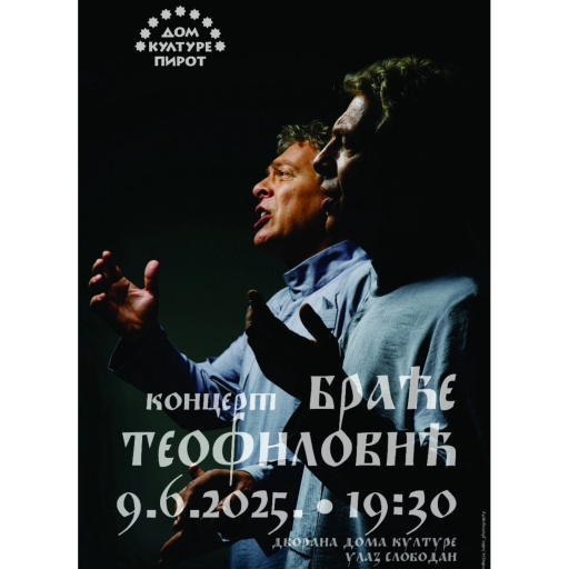 09. jun 2025. 07:43 U ponedeljak, 09. juna 2025. godine Dom kulture Pirot organizuje koncert jedinstvenih izvođača drevne srpske i balkanske vokalnemuzike - BRAĆA TEOFILOVIĆ.Koncert će se održati u dvorani Doma kulture ... -