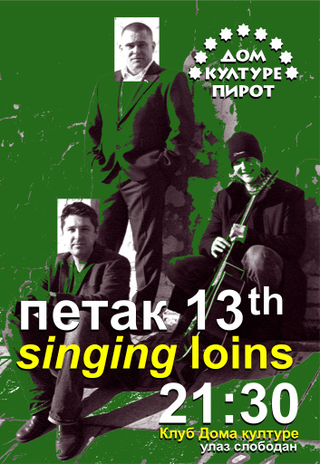 11. sep 2024. 10:34 Dom kulture Pirot u petak, 13. septembra organizuje koncert grupe Singing Loins. Koncert u Klubu Doma kulture počinje u 21 sat i 30 minuta. -