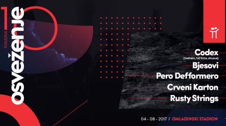 26. jul 2017. 12:00 Deseti muzički festival Osveženje održaće se u petak 4. avgusta na Omladinskom stadionu sa početkom u 20 časova. Ovom prilikom nastupiće Rusty strings, Crveni karton, Pero Defformero, Bjesovi i Codex.... -